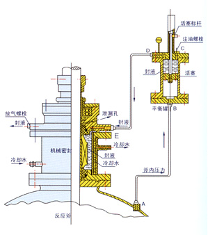 1、釜内压力由A至平衡罐B,推动平衡罐活塞底部,压迫活塞上升,推动平衡罐封液,由平衡罐出液处D至机械密封E,进入密封腔.至使封液产生压力,达到与釜内压力相平衡之目的,十分可靠地起到密封作用。