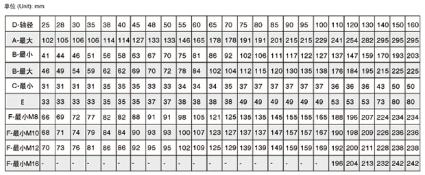A-盖直径   B-填料腔内径直   C-轴或轴套直径   E-填料腔外侧密封长度   F-相应于不同螺栓规格的最小螺栓中心距